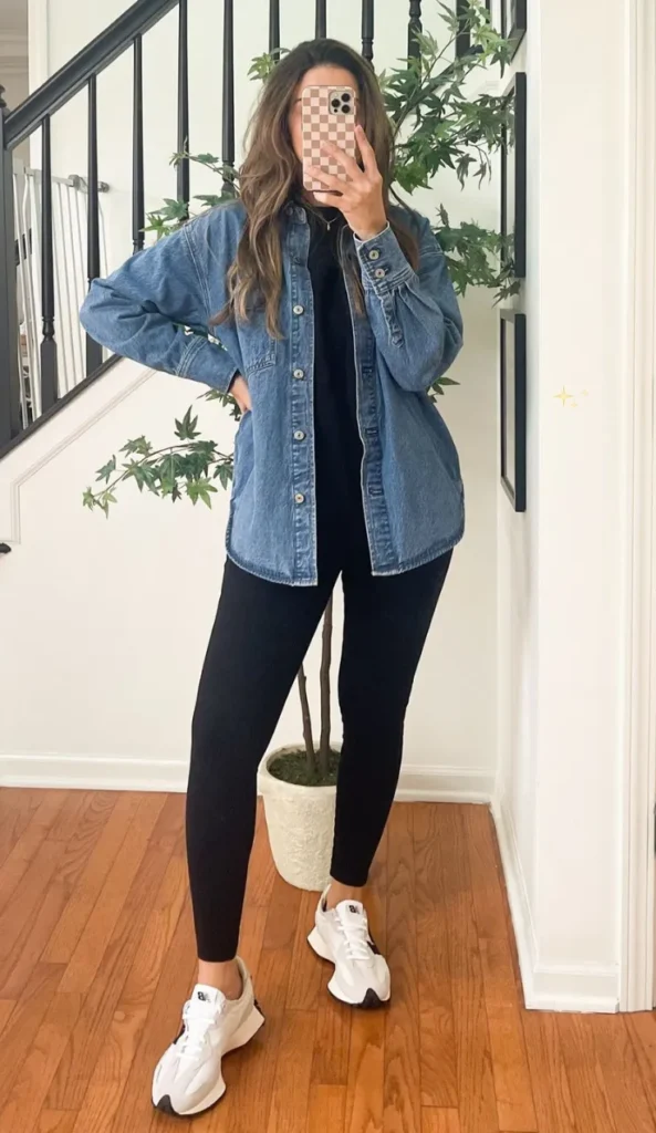 4. Cropped Denim Jacket + Faux Leather Leggings + Chunky Sneakers